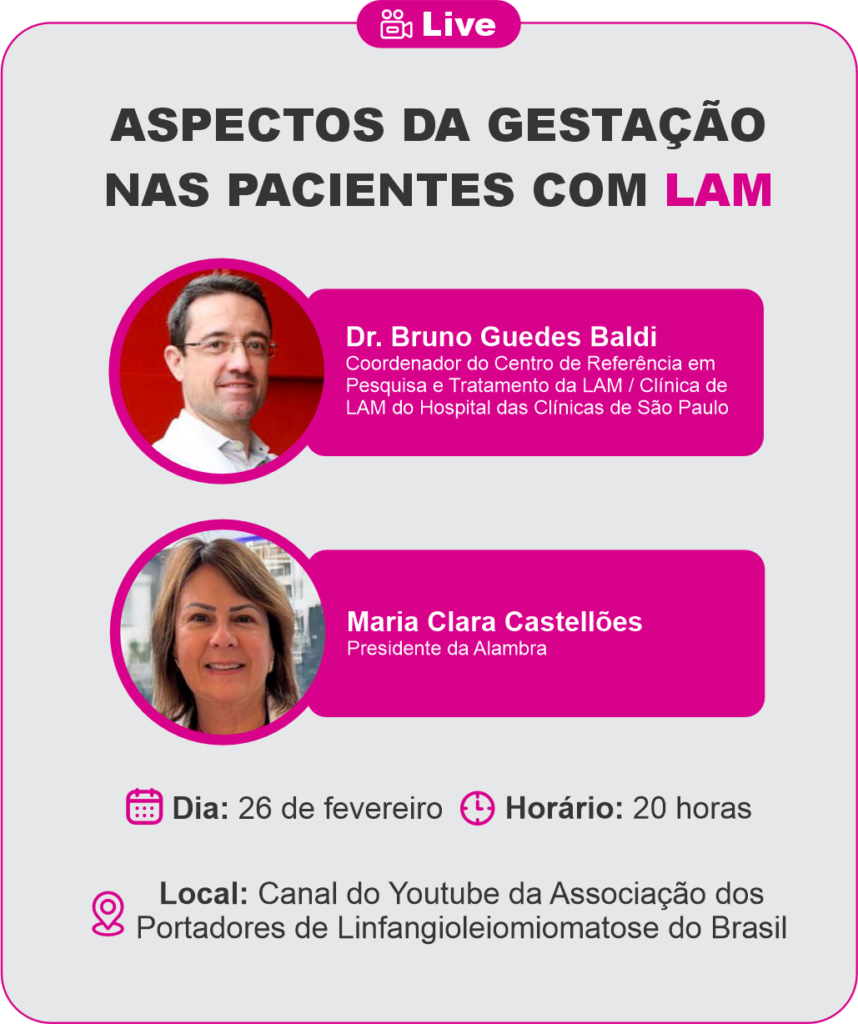 A Alambra possui um grupo no WhatsApp que tem por finalidade prestar esclarecimentos sobre a LAM e fornecer apoio a suas participantes. Caso você já tenha o seu diagnóstico confirmado e queira participar desse grupo, entre em contato com a associação através do e-mail: